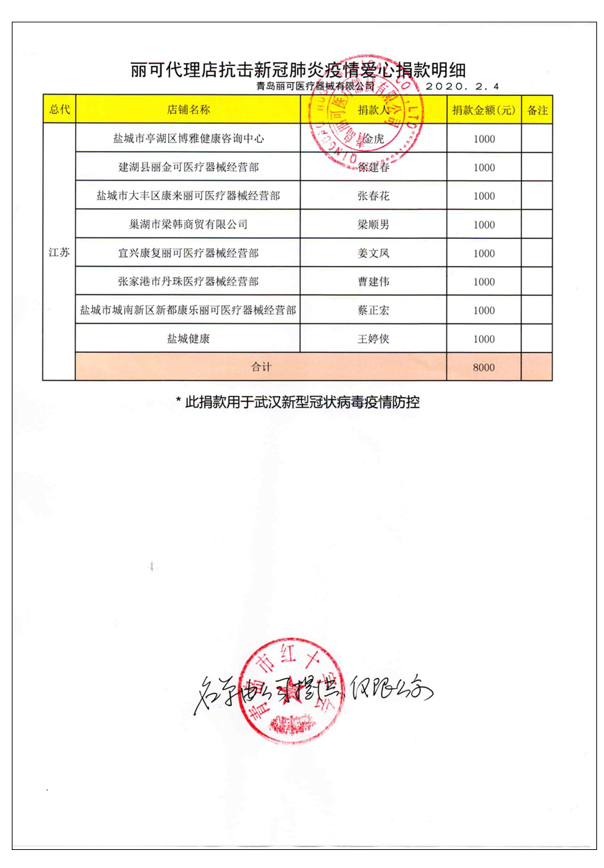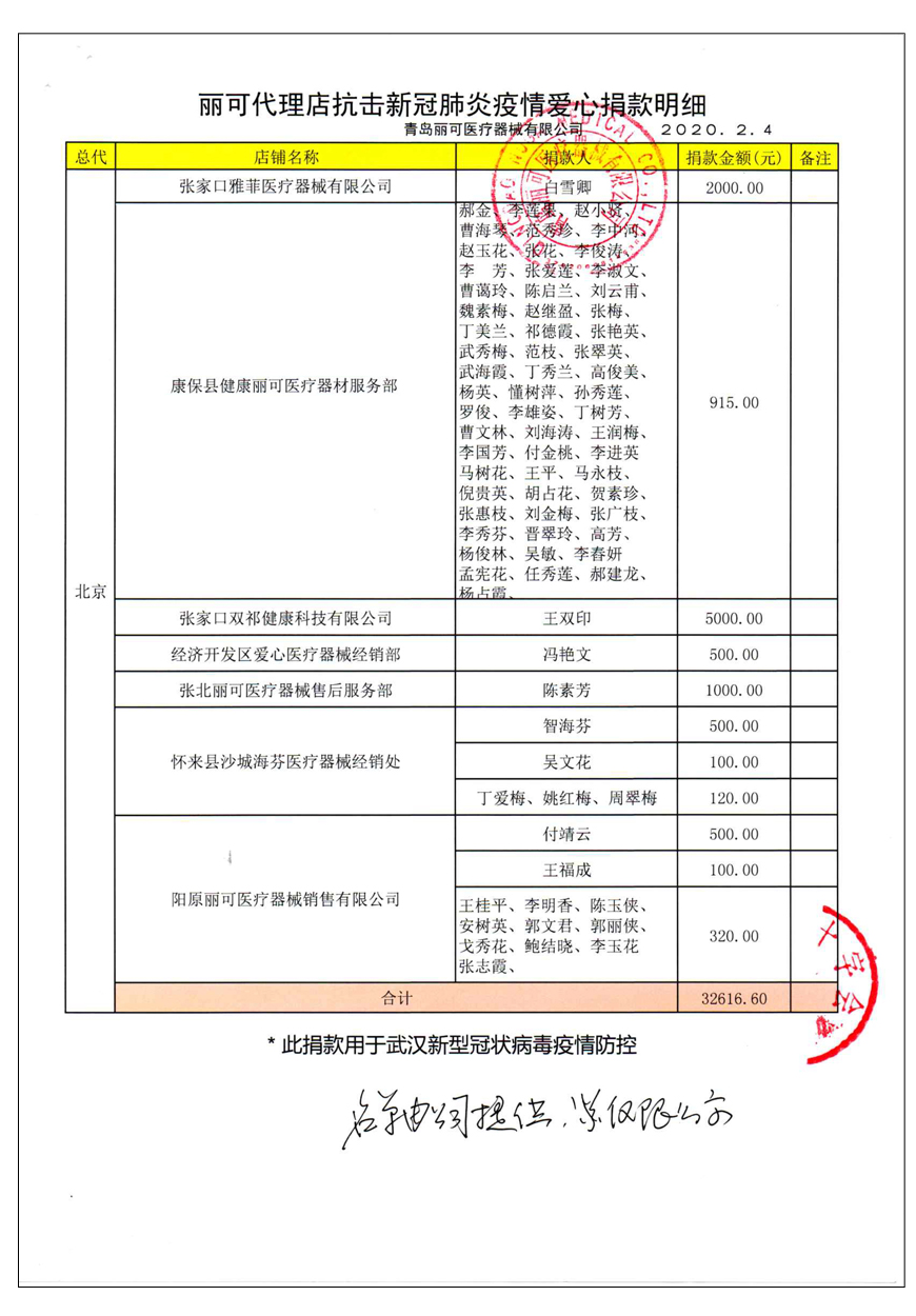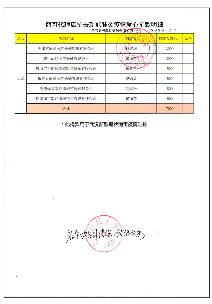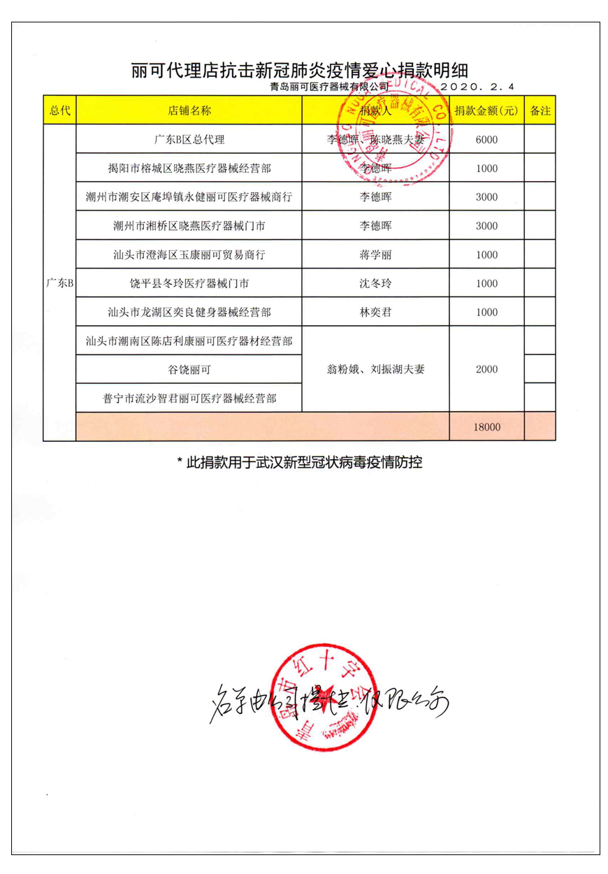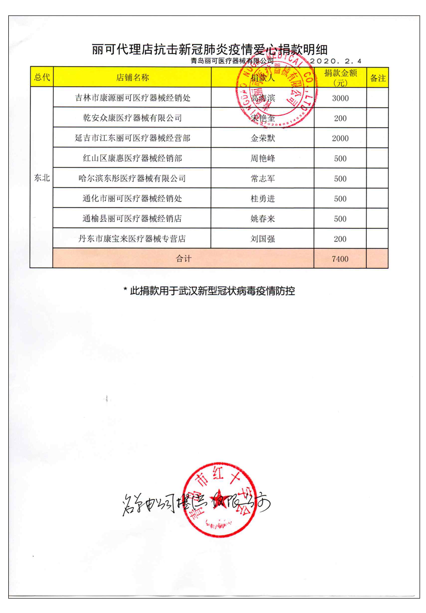 越來(lái)越多的人在麗可的號(hào)召下加入到愛(ài)心捐贈(zèng)的隊(duì)伍中來(lái),匯成一股愛(ài)心與力量的強(qiáng)大洪流。2月4日,青島麗可醫(yī)療器械有限公司攜手全國(guó)經(jīng)銷商以及熱心顧客通過(guò)青島市紅十字會(huì)捐款人民幣72萬(wàn)余元,助力湖北省武漢市的疫情防控工作。