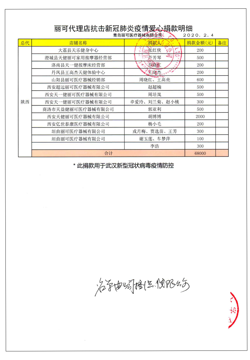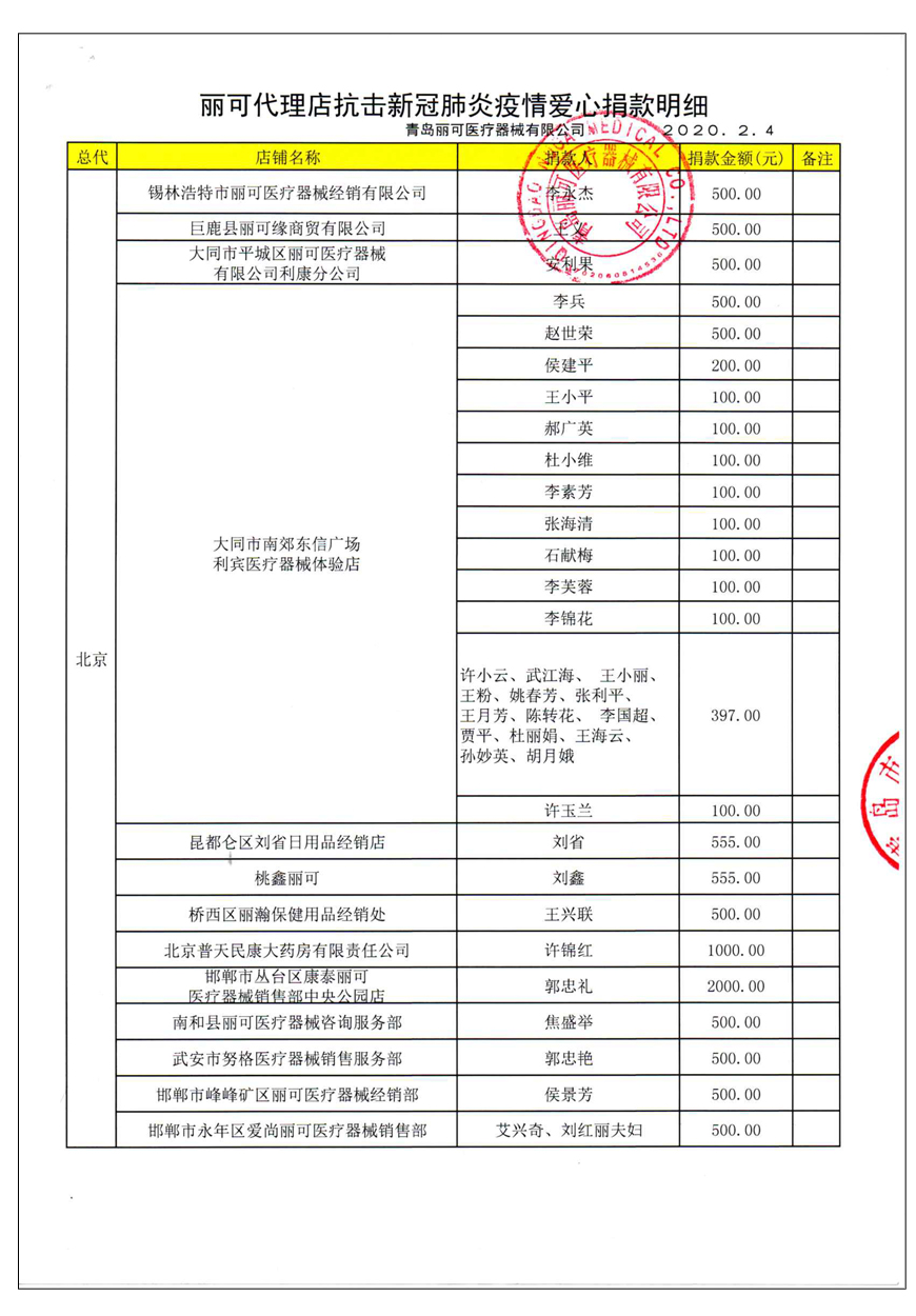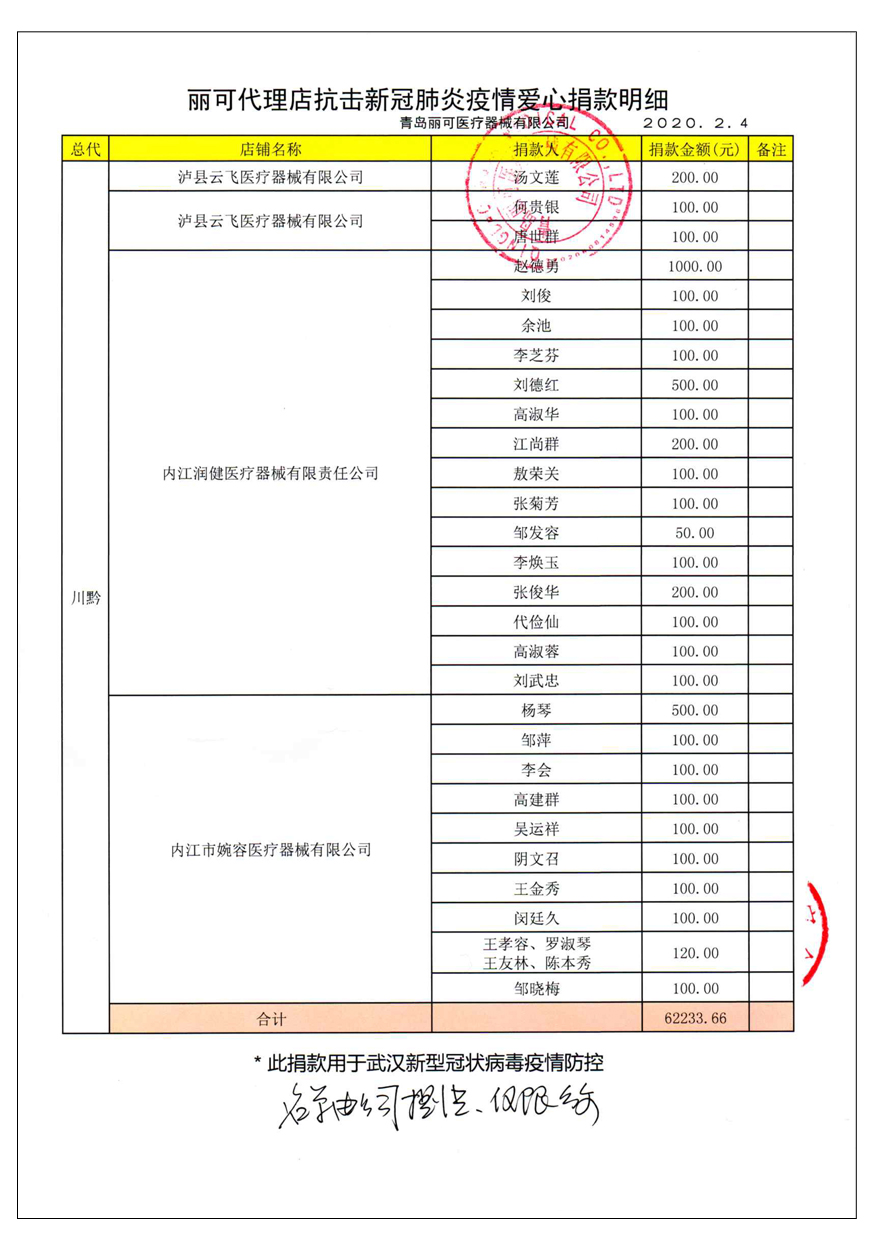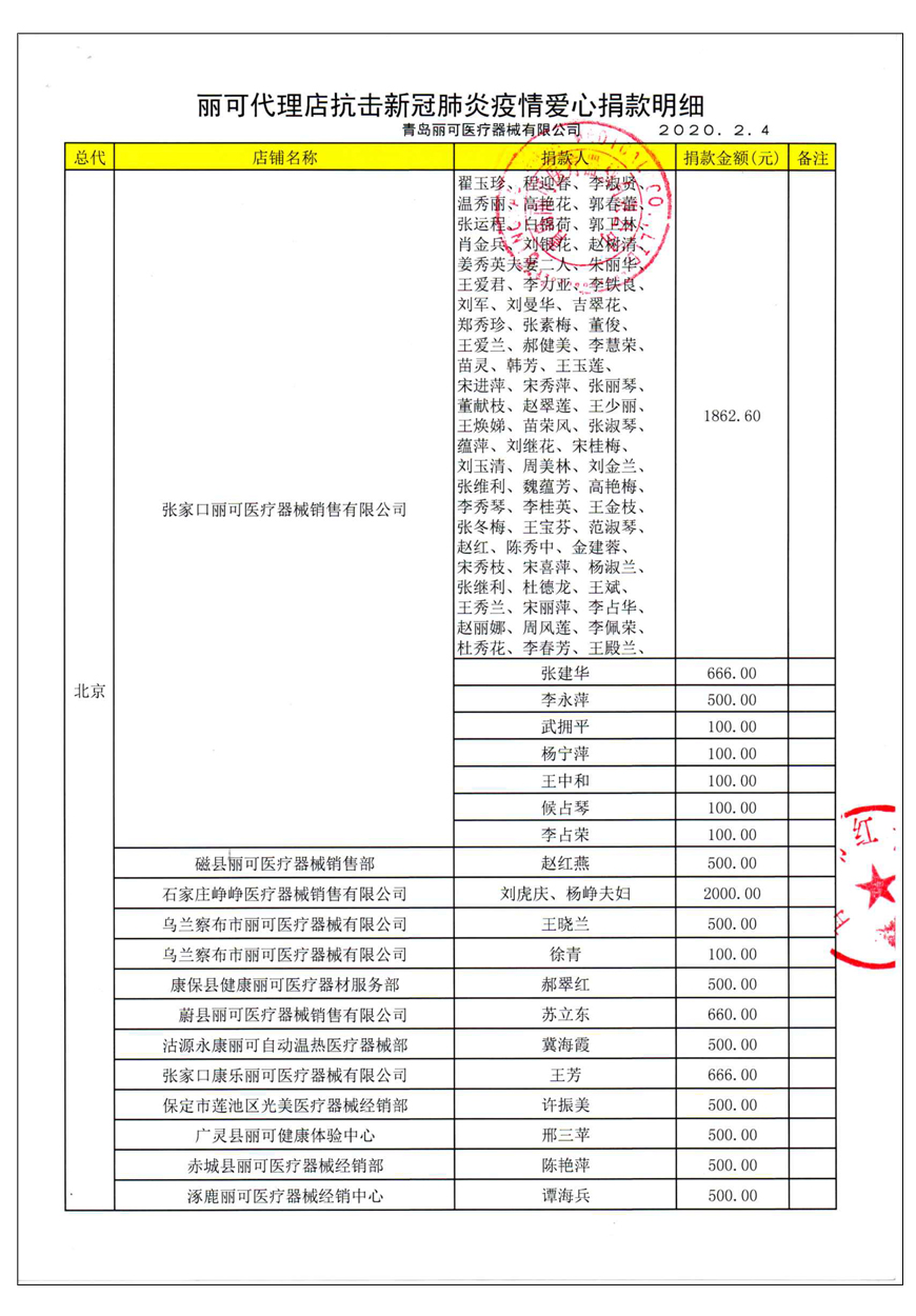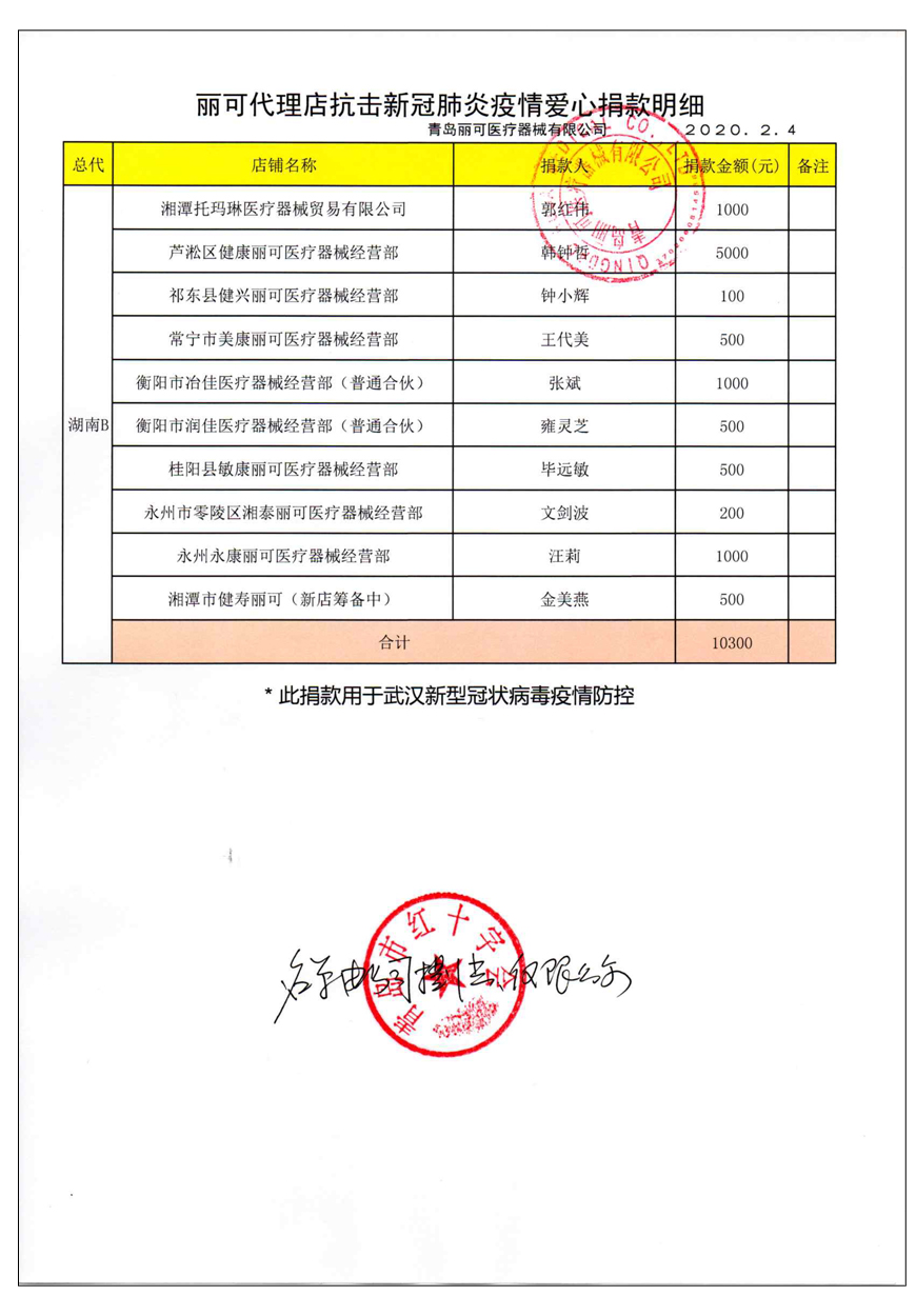 越來(lái)越多的人在麗可的號(hào)召下加入到愛(ài)心捐贈(zèng)的隊(duì)伍中來(lái),匯成一股愛(ài)心與力量的強(qiáng)大洪流。2月4日,青島麗可醫(yī)療器械有限公司攜手全國(guó)經(jīng)銷商以及熱心顧客通過(guò)青島市紅十字會(huì)捐款人民幣72萬(wàn)余元,助力湖北省武漢市的疫情防控工作。